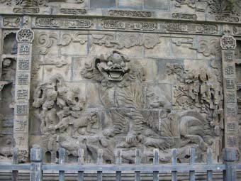 这座中国最大的照壁,也是最大的砖雕作品。照壁上的空间较大,通常刻有不祥、志趣等外容的图案,也是身份位置的象征,图中照壁的中央花部位还附有砖匾,刻上了府名。而花墙的砖雕与照壁相比略小,图案内容则较为生动。